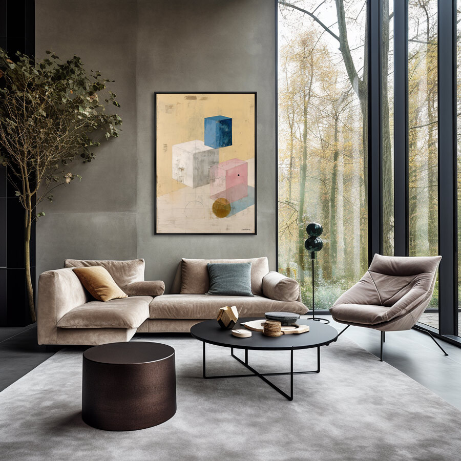 Большие картины следует размещать в центре комнаты на высоте 160 сантиметров. Это оптимальная точка, позволяющая рассмотреть всю композицию с расстояния нескольких метров.
