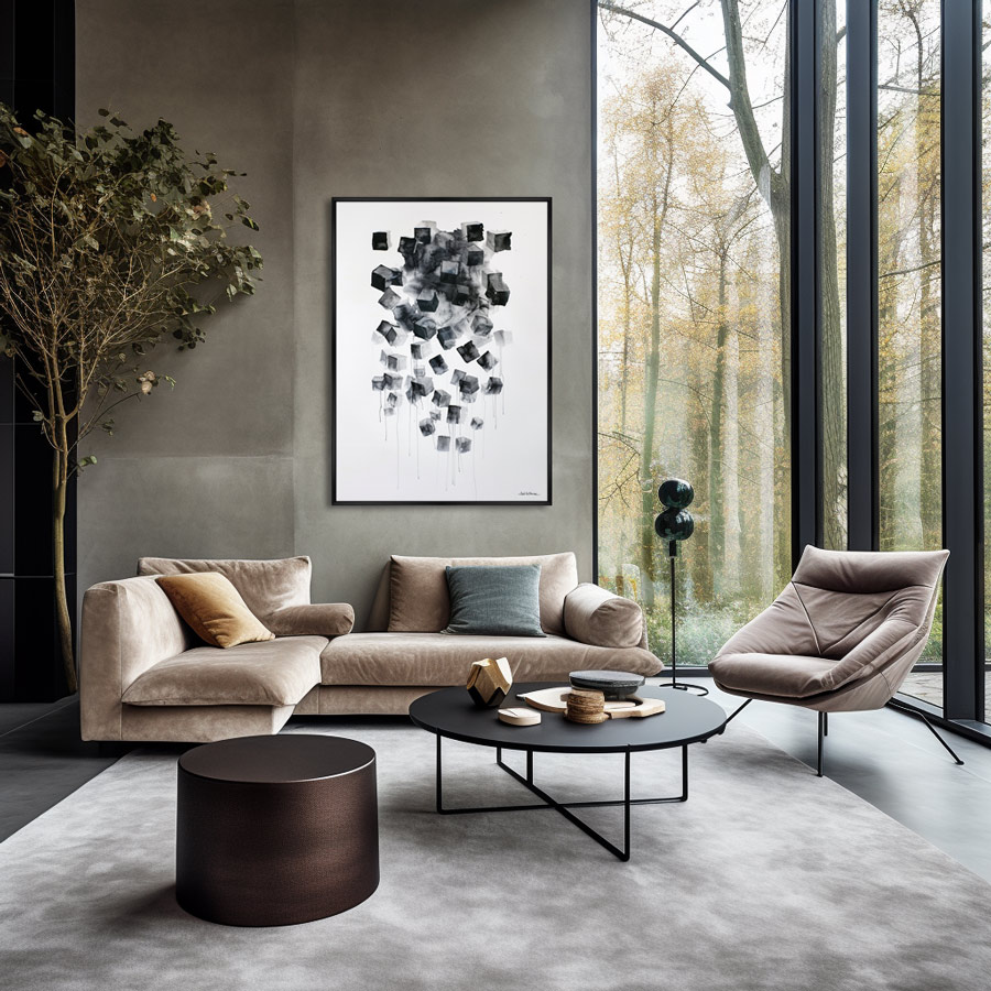Большие картины следует размещать в центре комнаты на высоте 160 сантиметров. Это оптимальная точка, позволяющая рассмотреть всю композицию с расстояния нескольких метров.