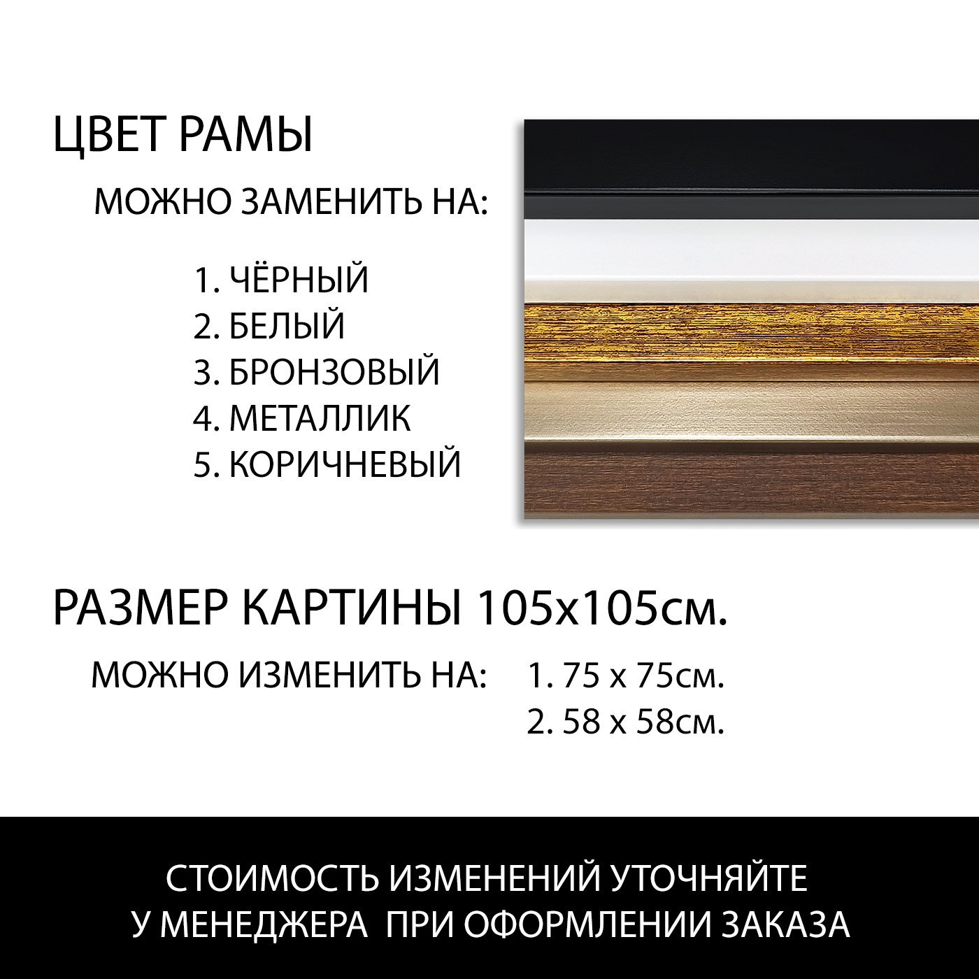 Для всех рамных репродукций используется натуральный холст или дизайнерская бумага, рамы из полистирола или древесной основы с защитной декоративной пленкой. Цветовые решения для рам подобраны от классических - белый и черный, до популярных сейчас - притемненный металлик и золото. Все картины имеют настенный металлический крепёж на задней стороне рамы. Для большинства картин на бумаге используется хлопковое паспарту и защитное стекло.