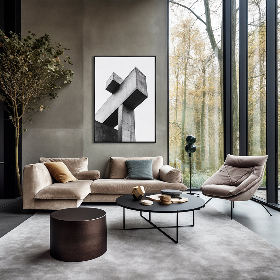 Большие картины следует размещать в центре комнаты на высоте 160 сантиметров. Это оптимальная точка, позволяющая рассмотреть всю композицию с расстояния нескольких метров.
