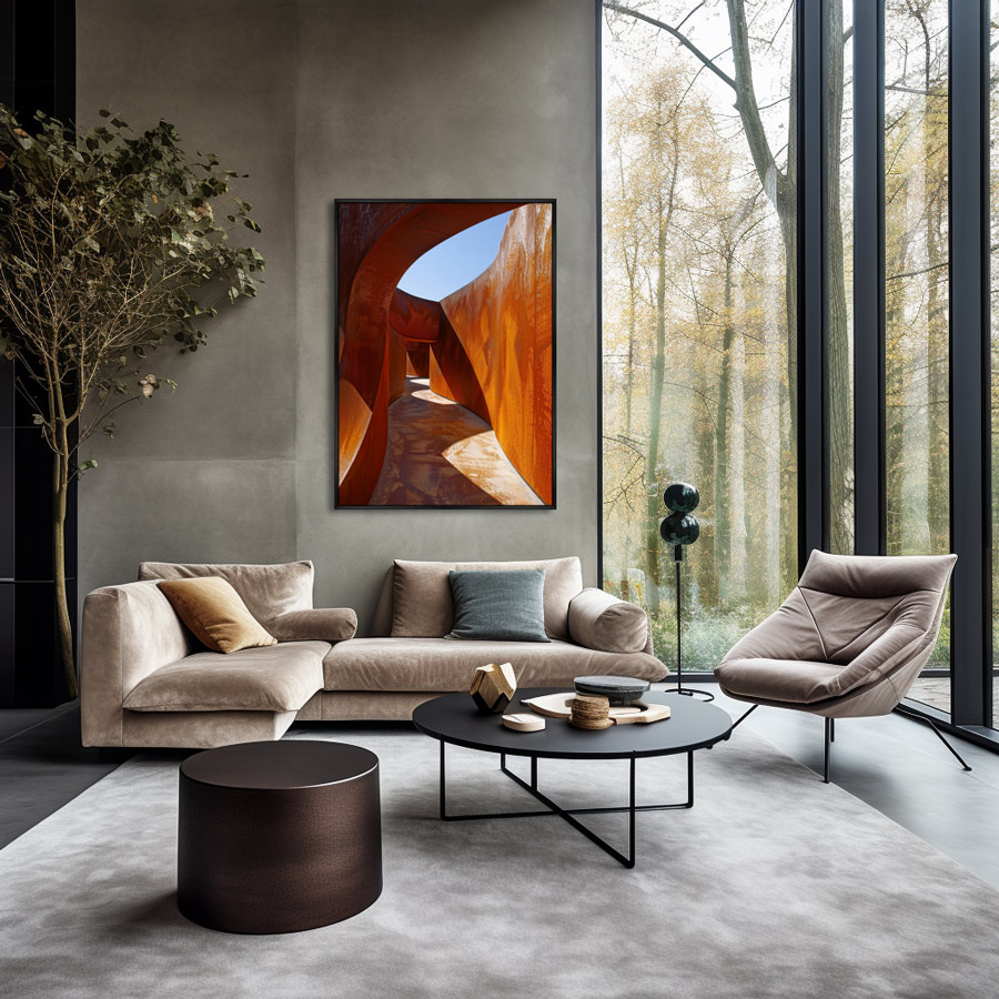 Большие картины следует размещать в центре комнаты на высоте 160 сантиметров. Это оптимальная точка, позволяющая рассмотреть всю композицию с расстояния нескольких метров.