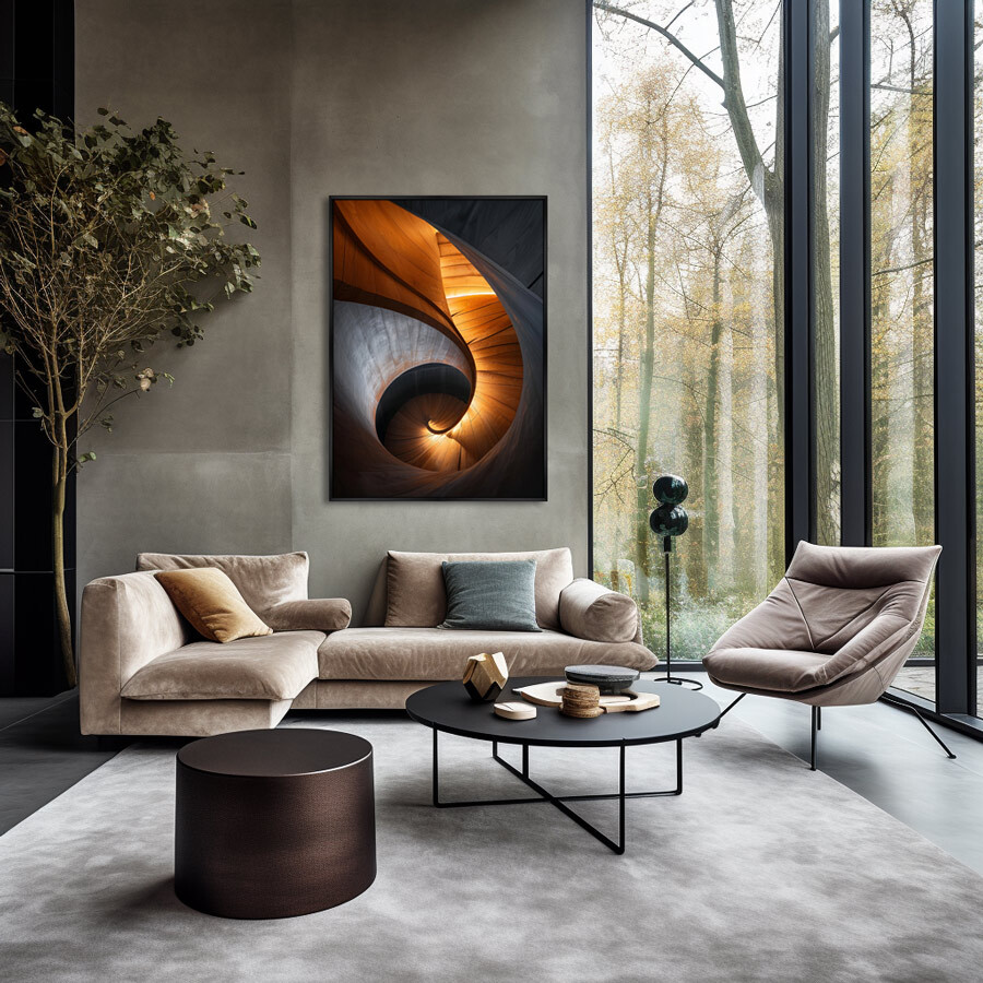 Большие картины следует размещать в центре комнаты на высоте 160 сантиметров. Это оптимальная точка, позволяющая рассмотреть всю композицию с расстояния нескольких метров.